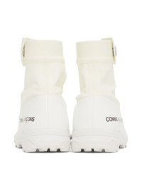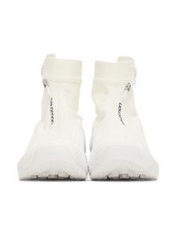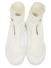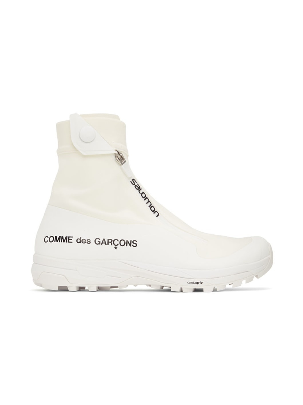 High-top water-repellent jersey sneakers in off-white. Tonal bonded trim throughout. · Zip closure featuring logo bonded in black at vamp · Elasticized collar with press-stud fastening · Logo printed in black at outer side · Sculptural rubber midsole · Treaded Contagrip® rubber outsole Part of the Comme des Garçons x Salomon collaboration. Supplier color: White Upper: textile, synthetic. Sole: rubber.