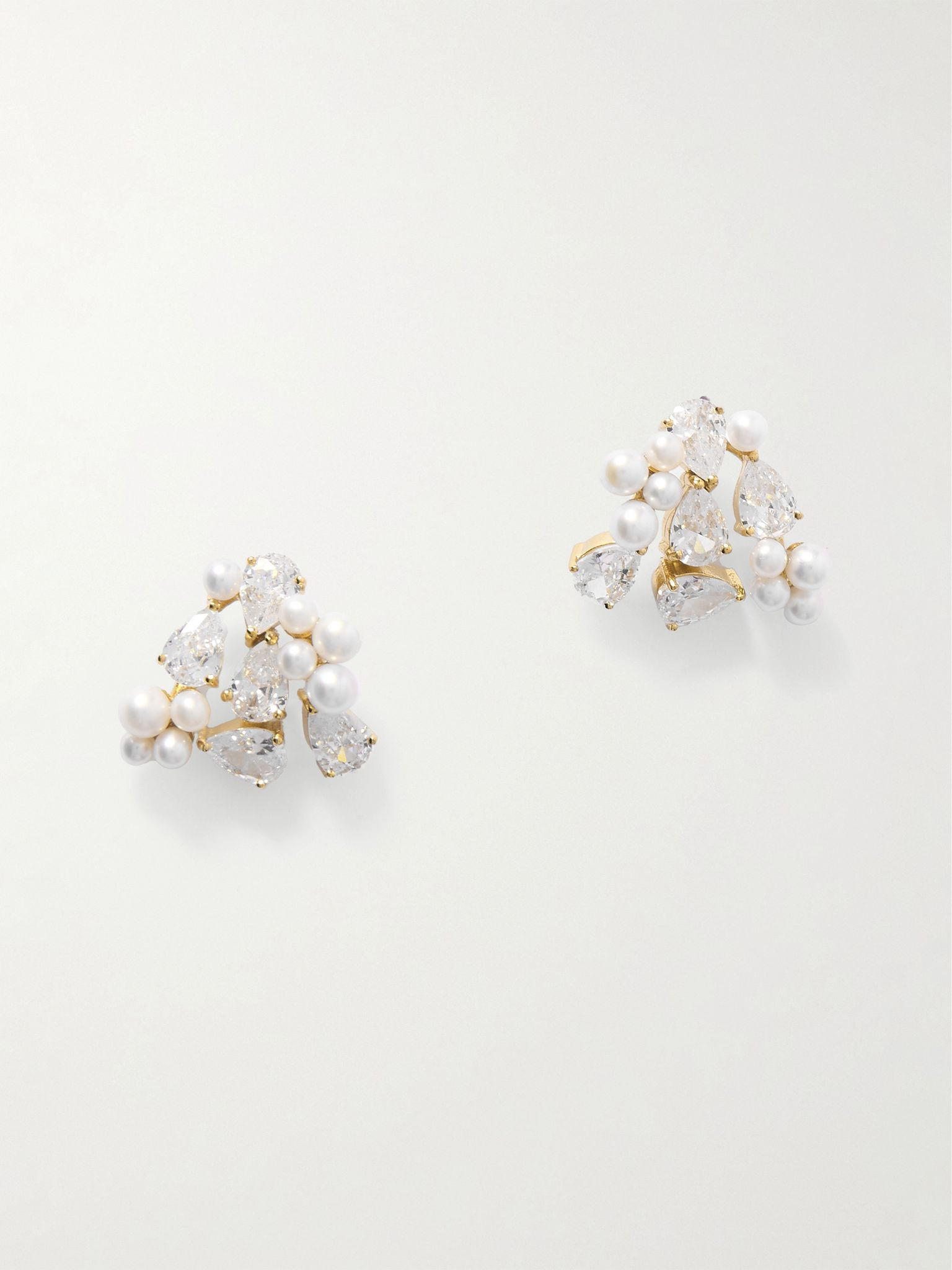 Gold-plated recycled silver, cubic zirconia and pearl earrings White