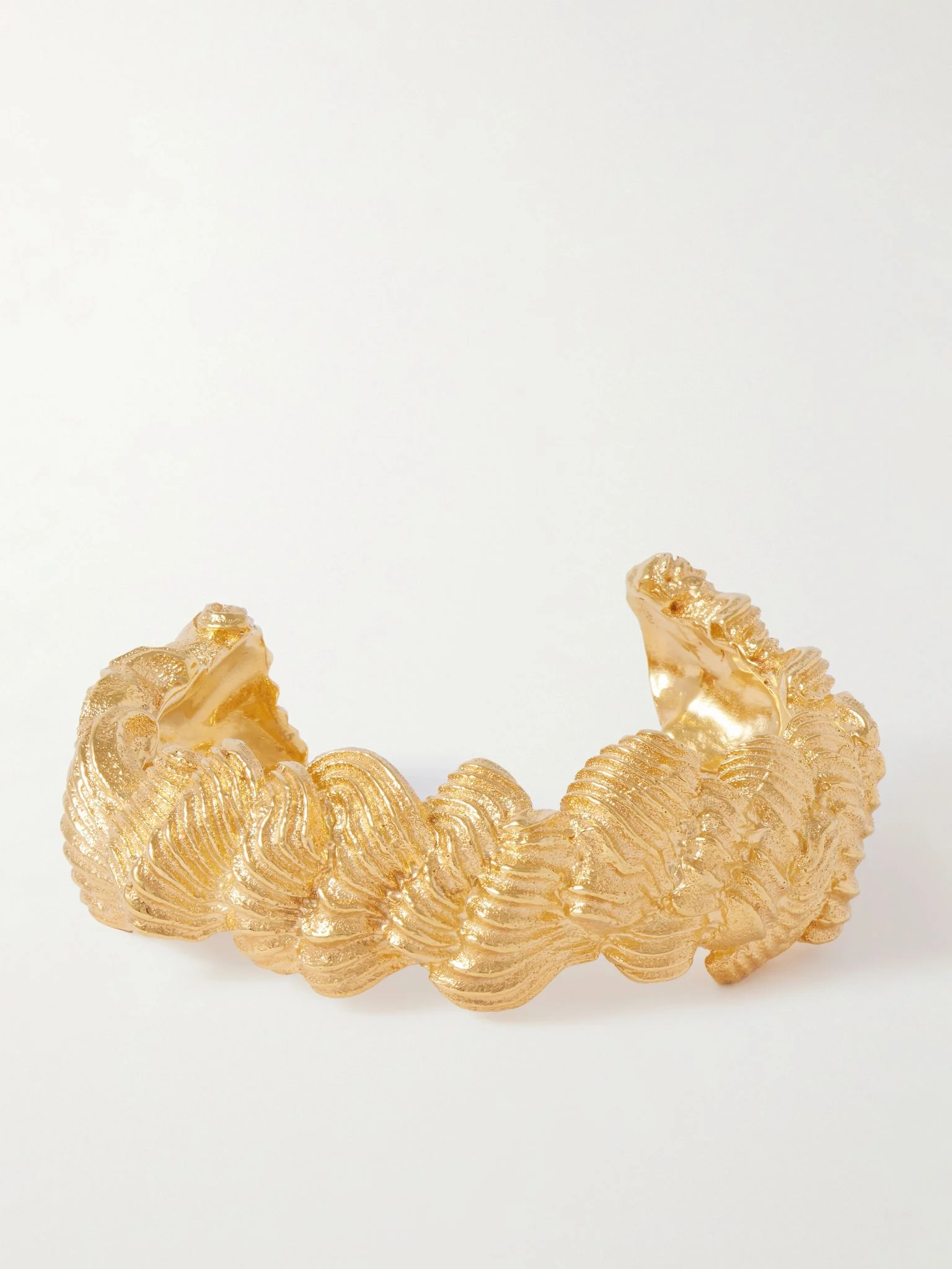 Completedworks' cuff will add an elegant touch to everyday outfits. It’s crafted from gold-plated brass and moulded in a sculptural shape with a rippled effect. Size & Fit - Measurements can be found in the link below Details & Care - Slips on