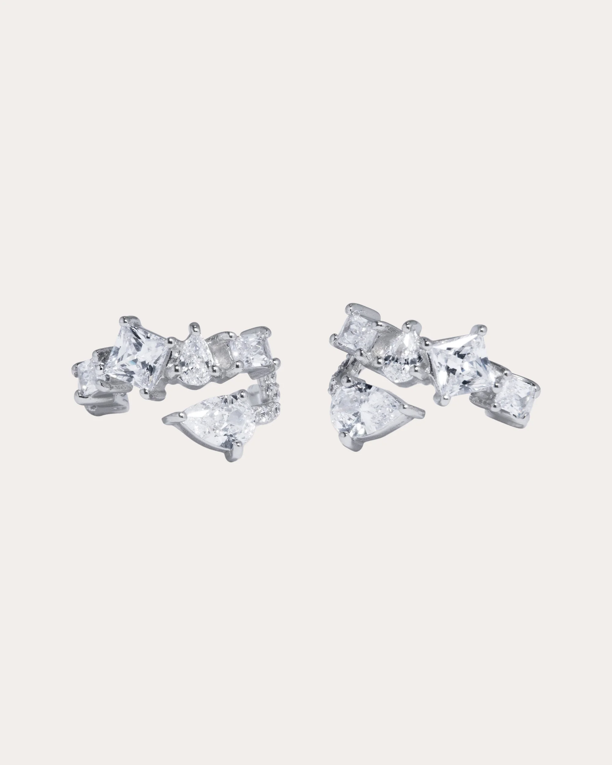 Sculptural in form, these silvertone earrings are decorated with various cuts of cubic zirconia stones to create geometric shimmer. Post-back closure Rhodium-plated recycled sterling silver and cubic zirconia Polish with soft cloth Made in Thailand Measurements Width: 1in Length: 0.25in
