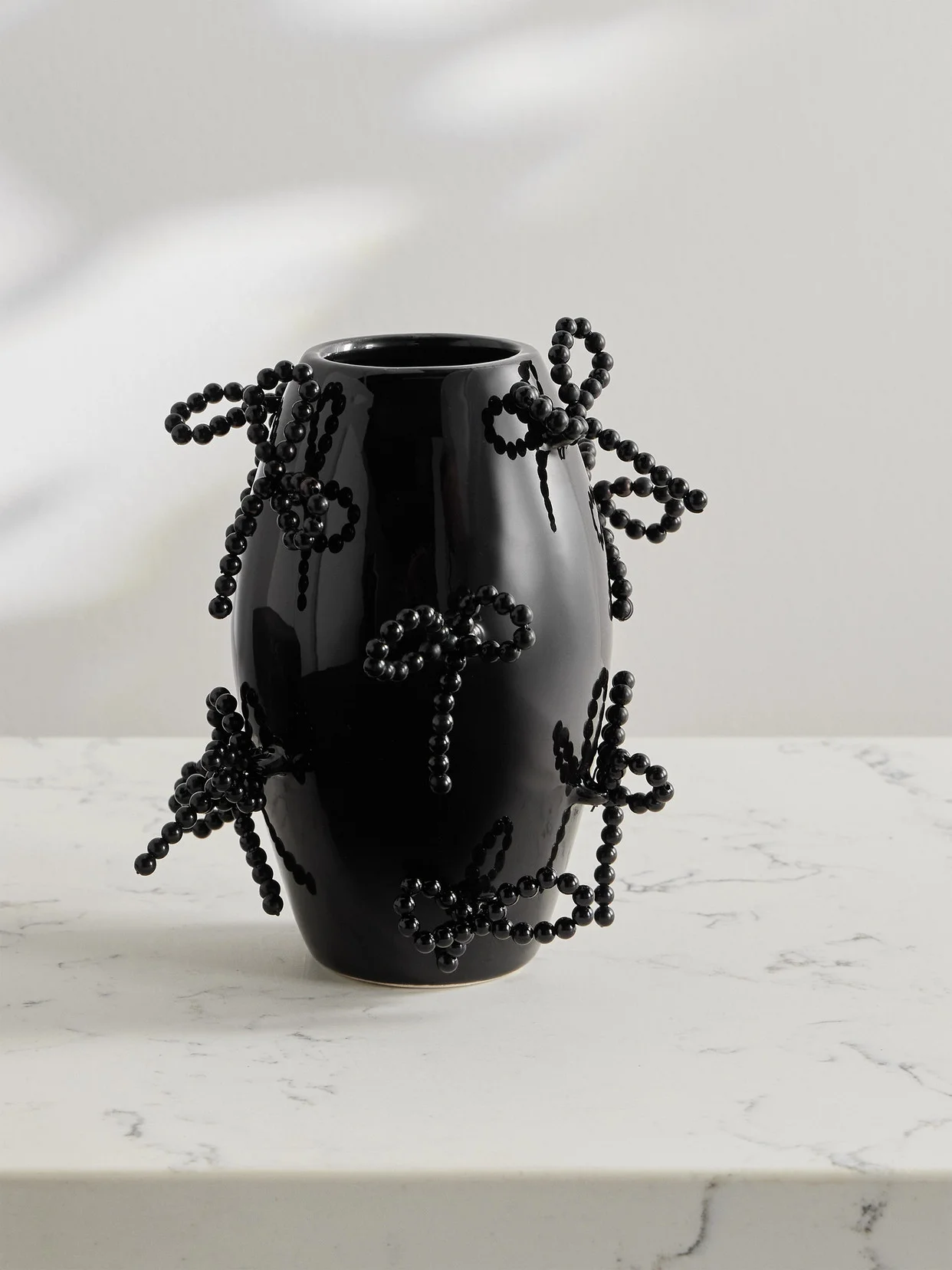 Even without flowers, Completedworks' large vase stands as a whimsical piece of art. It's sculpted from ceramic and flutters with bows - each is handmade from a length of faux pearls for a soft glow under light.