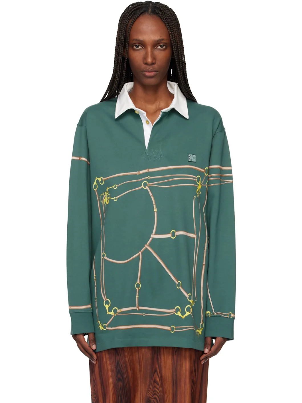 Heavyweight organic cotton jersey polo. · Poplin spread collar · Concealed two-button placket · Logo patch embroidered at chest · Graphics printed at front and sleeves · Tennis-tail hem · Dropped shoulders · Quilted elbow patches · Rib-knit cuffs · Logo-engraved mother-of-pearl hardware Supplier color: Green 100% organic cotton. Made in Portugal 261954F108000