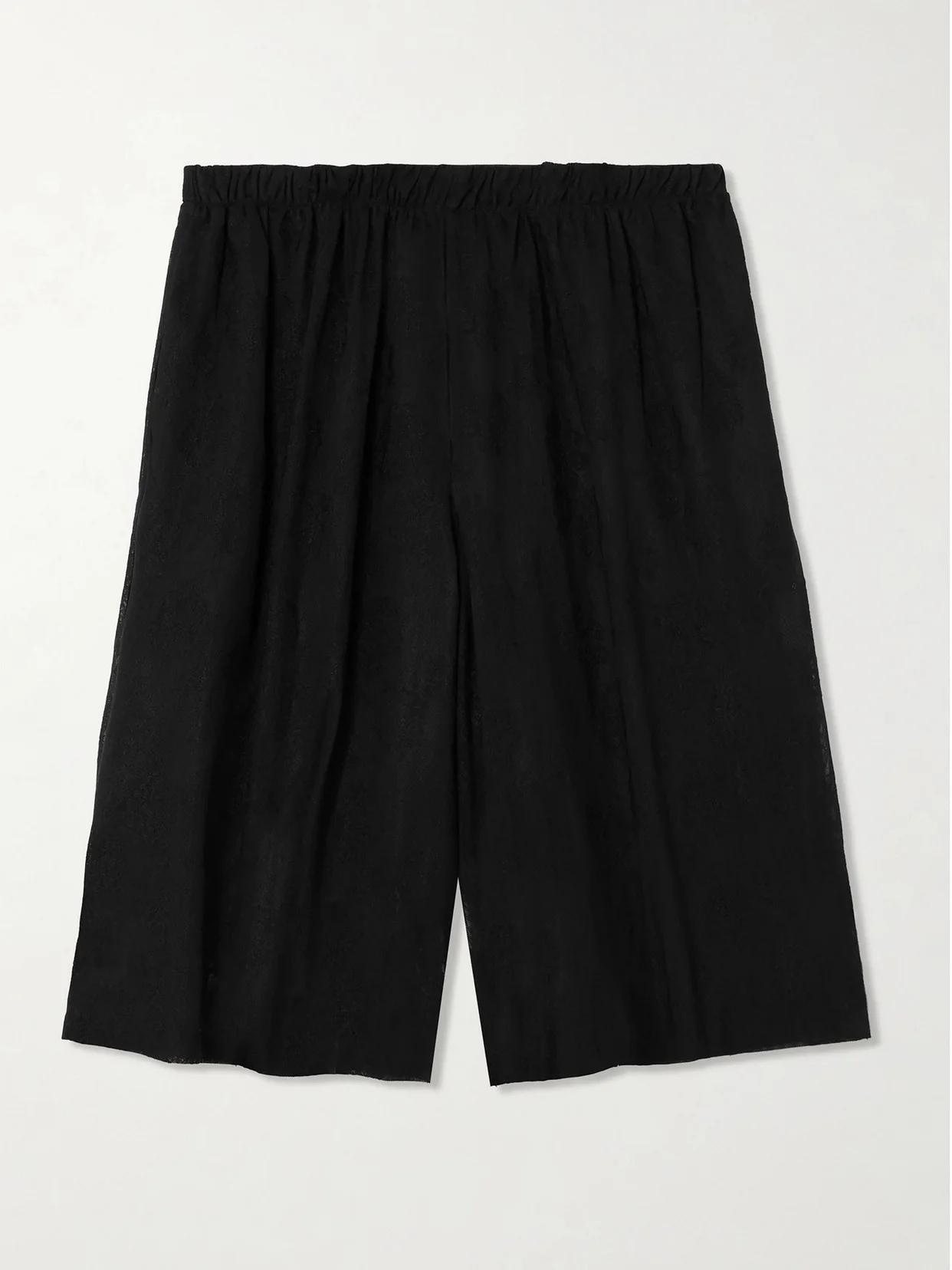 Conner Ives' shorts are a delicate take on classic basketball styles. Made in the UK from lace, they have a high-rise and fall to loose legs that hit just above the knee. The perforated mesh lining tempers the sheerness.