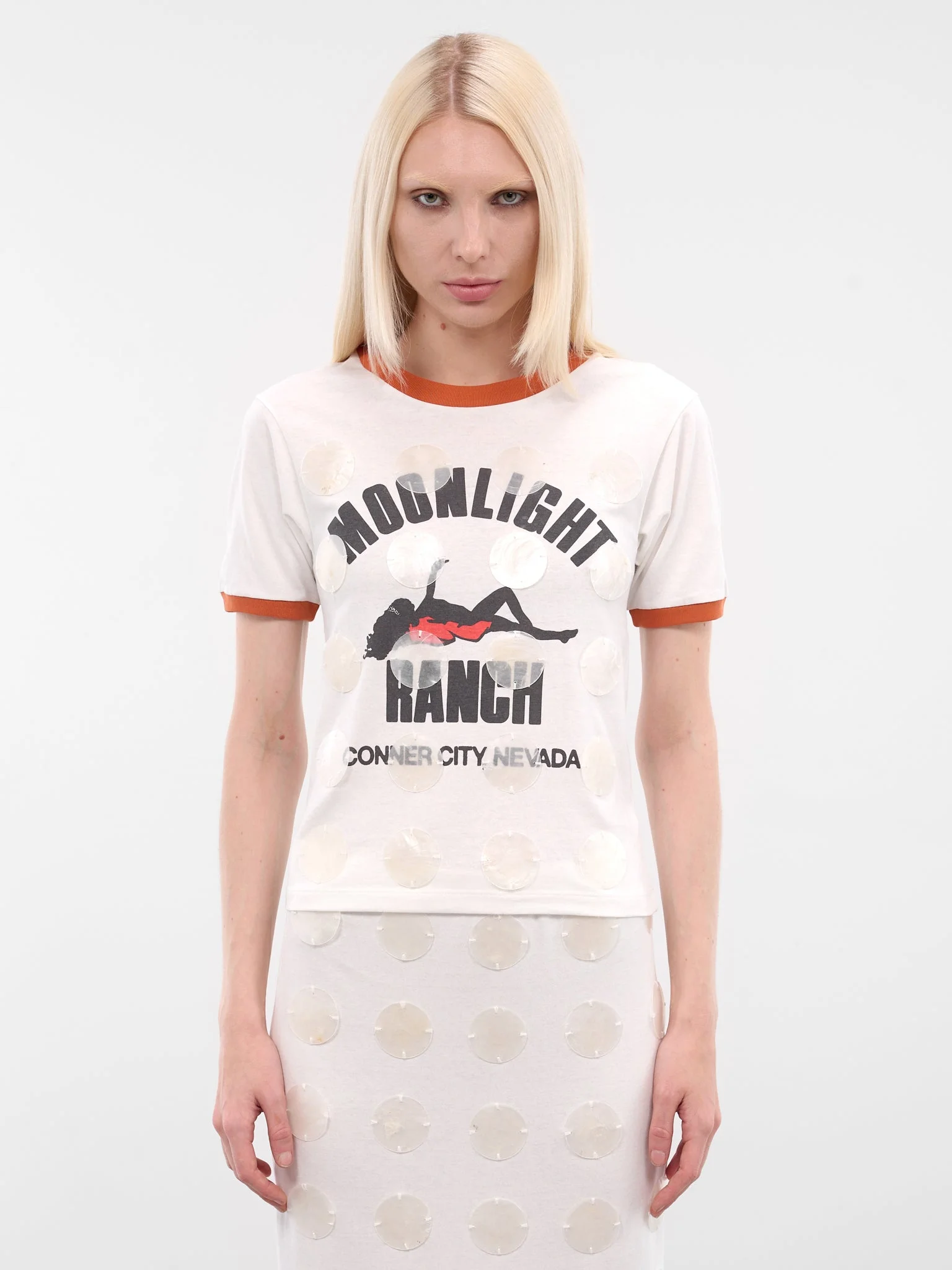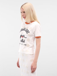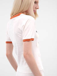 White cotton ringer tee with graphic print, front MOP sequin embellishment, and contrast crewneck and hems. Featuring: • Slim fit • Cotton construction • Ringer tee design • Graphic print • Front MOP sequin embellishment • Contrast crewneck and hems • Short sleeves • Made in Portugal • 100% Organic Cotton • Standard sizing Model is 5'9" wearing size S. Bust: 32" Waist: 25" Hips: 34"