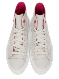 High-top canvas sneakers in beige. Tonal round grained leather cap toe. Tonal lace-up closure. Tonal grained leather tongue. Eyelet vents and tonal leather logo patch embroidered at inner side. Canvas lining in pink. Treaded rubber platform sole in white with logo patch at heel in pink. Tonal hardware. Approx. 2" platform. Supplier color: Pale putty/Pink Upper: textile, leather. Sole: rubber.