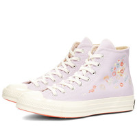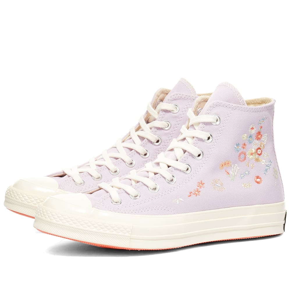 Put some spring into your step with this blooming great pair Chuck 70 sneakers from Converse. Brimming with all the iconic ‘70s style we know and love, the purple canvas uppers are decorated with delicately embroidered blooms at the sidewalls and sit atop entirely off-white chunky soles for that signature vintage look. - Canvas Uppers - Rubber Toe Cap - OrthoLite Cushioning - High Foxing Tape - Gum Rubber Sole