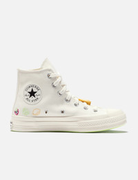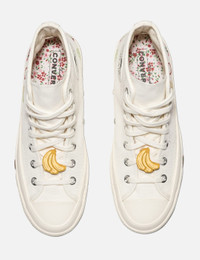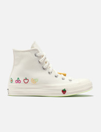 - Converse - Chuck 70 Hi - Hi-top - Canvas upper with fruit embroidery - Lace-up closure - Rubber fruit embellishment on the lace - Signature star ankle patch - OrthoLite cushioning - Brand label patch at the heel - Banana patch at the midsole - Rubber outsole - Color: Egret/Egret/Green Beam - Material: Canvas, Rubber - See more Sneakers and Shoes
