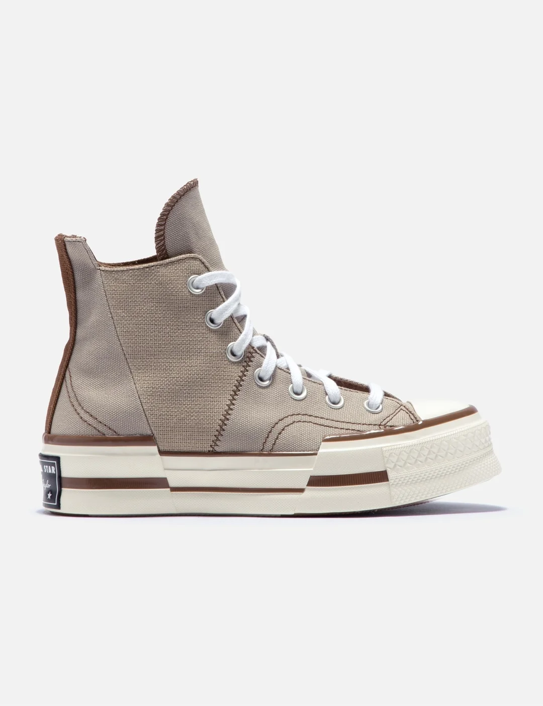 - Converse - Chuck 70 Plus Hi - Canvas upper - Asymmetrical, fused design - Elongated tongue - Split rubber outsole and Chuck Taylor logo design - Lace-up closure - Rubber toe cap - OrthoLite cushioning - Rubber outsole - Color: Wonder Stone/ RedOak /White - Material: Textile, Rubber - See more Sneakers and Shoes