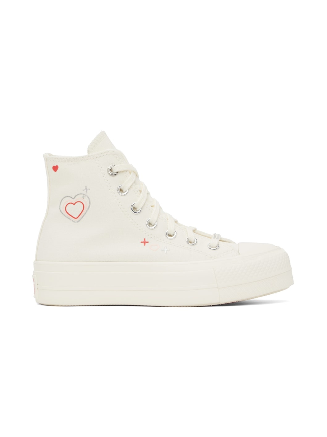 High-top canvas sneakers in off-white. · Crystal-cut appliqués and graphics bonded throughout · Rubber cap toe · Lace-up closure · Padded collar · Leather logo patch at inner side · Eyelets at inner side · OrthoLite® padded footbed · Mesh lining · Platform rubber midsole · Rubberized logo patch at midsole · Treaded rubber sole · Platform: H1.25" Supplier color: Egret/Fever dream/Egret