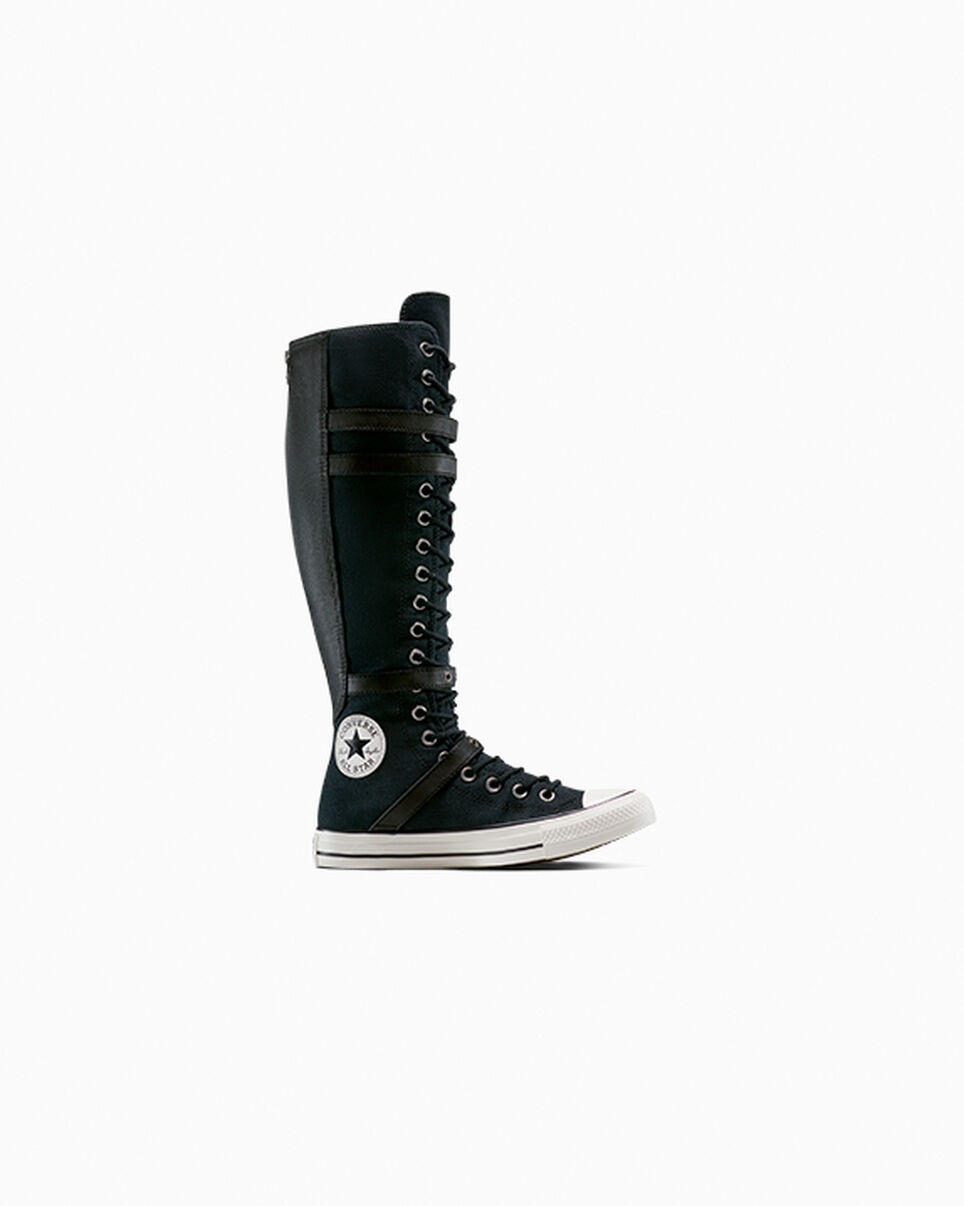 Your original favorite amps up the attitude. OPEN THE PIT Basketball shoe turned cultural icon, the Chuck Taylor All Star is always evolving. These knee-high Chucks are proof that one person's "bad influence" is another's "punk muse"—with leather straps and overlays for a little extra edge. WHY YOU SHOULD BE DOWN - Durable canvas upper for that classic Chucks look and feel - Named after basketball coach and Converse salesman, Chuck Taylor - OrthoLite cushioning helps provide optimal underfoot comfort - Leather buckled straps and overlays harness the spirit of goth fashion - Adjustable laces and a zippered closure at the back helps you find the right fit - SKU: A16600C