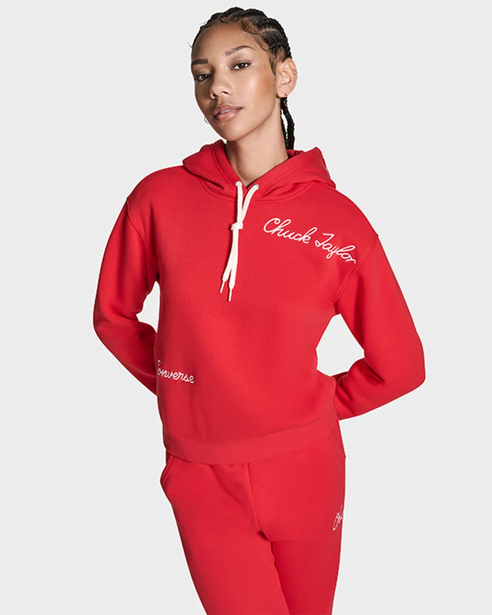 For those who embrace the unexpected. STITCHED IN STYLE Sleek fleece hoodie is cozy but composed, with cursive embroidery just off-center for an elevated twist. WHY YOU SHOULD BE DOWN - Classic fleece fabric feels soft and cozy - Standard fit for a relaxed, easy feel - Embroidered Converse script reps the legacy - Drawstring hood for adjustable coverage - 80% Cotton, 20% Polyester - SKU: CVW6H095-RED