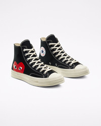A fan-favorite collab, the Comme des Garcons PLAY Chuck 70 sneaker puts a playful spin on a classic. CLASSIC CHUCK 70 WITH A PLAYFUL TWIST. Wear your heart on your shoes with the Converse x Comme des Garcons PLAY Chuck 70 sneaker. This street-ready style features the premium Chuck details you know and love, paired with a whimsical heart-and-eyes graphic peeking just above the sole. Eye-catching is an understatement. WHY YOU SHOULD BE DOWN - Canvas is lightweight and durable. - Tonal rubber toe cap and contrasting heelstay for standout style. - Lace-up design for a snug fit. - Vulcanized rubber sole for increased traction. - Signature heart-and-eyes logo adds a fun flair. - SKU: A08791C