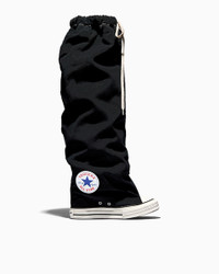 The playfully avant-garde fashion label Vaquera gives a provocative stance to classic Chucks with a knee high slouch wedge edition. CONVERSE X VAQUERA A collision of icons brings the rebellious spirit of Vaquera and Cortisa Star to Converse style. A knee high waxed canvas upper and Chelsea wedge insole give the All Star look a provocative new stance—a little baggy and oversized with a top lace and elastic webbing for style versatility. Lace up a bold new statement piece with the Chuck Taylor All Star XXXHi Slouch Wedge from Vaquera. WHY YOU SHOULD BE DOWN - Waxed canvas baggy oversized knee-high upper with 8oz canvas lining - Top lace and elastic webbing for style versatility - Internal Chelsea boot framework with tongue and heel pull - Classic foxing tape - Custom deboss Vaquera branded ankle patch on left medial and license plate - SKU: A17691C