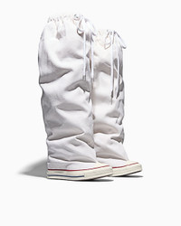 The playfully avant-garde fashion label Vaquera gives a provocative stance to classic Chucks with a knee high slouch wedge edition. CONVERSE X VAQUERA A collision of icons brings the rebellious spirit of Vaquera and Cortisa Star to Converse style. A knee high waxed canvas upper and Chelsea wedge insole give the All Star look a provocative new stance—a little baggy and oversized with a top lace and elastic webbing for style versatility. Lace up a bold new statement piece with the Chuck Taylor All Star XXXHi Slouch Wedge from Vaquera. WHY YOU SHOULD BE DOWN - Waxed canvas baggy oversized knee-high upper with 8oz canvas lining - Top lace and elastic webbing for style versatility - Internal Chelsea boot framework with tongue and heel pull - Classic foxing tape - Custom deboss Vaquera branded ankle patch on left medial and license plate - SKU: A17690C