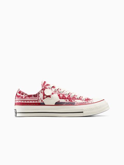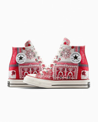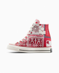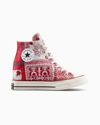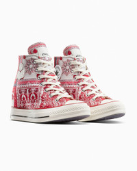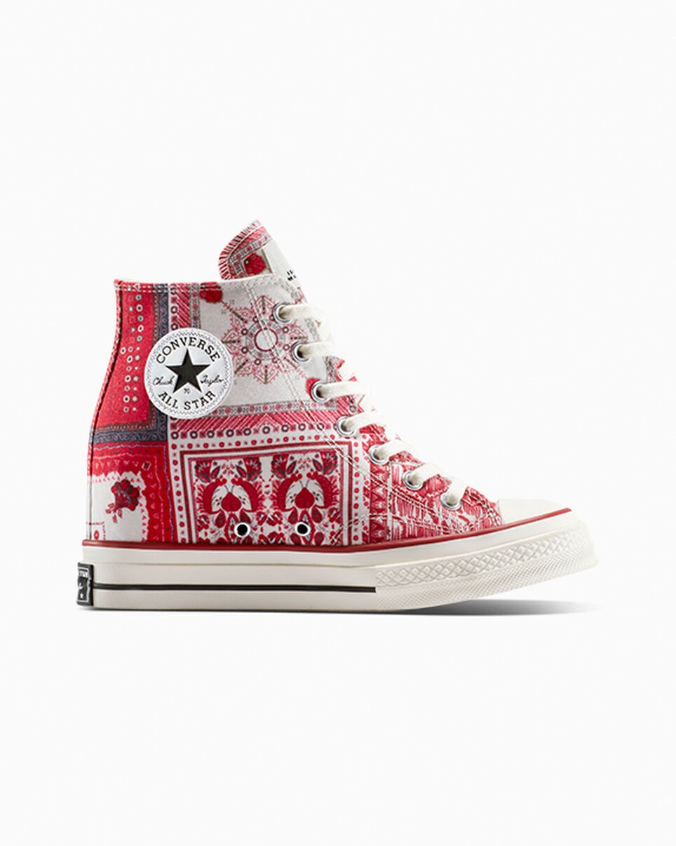 The French fashion icon unites her famous wedge sneaker with the premium Chuck 70. CONVERSE X ISABEL MARANT The French fashion brings her famous wedge sneaker concept to the premium Chuck 70, giving the iconic silhouette a unique elevated stance. Blending effortless luxury style cues with classic Converse details, the limited-edition design captures the essence of Isabel Marant’s laid back but elevated aesthetic. Sophisticated materials, raw edge overlays, and vibrant swirls of color create a distinctive carefree vibe. WHY YOU SHOULD BE DOWN - Limited-edition high top wedge sneaker designed by Isabel Marant with frayed cotton and polyester jacquard upper - Isabel Marant branded tongue label and raw edge canvas overlay logo on lateral - Translucent outsole with matching multi-color print - Flat spun multi-colored sub printed lace with frayed edge and secondary flat cotton lace - 2.5" internal wedge - SKU: A14802C