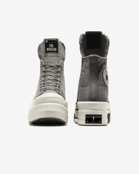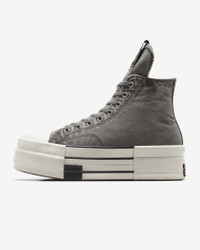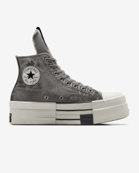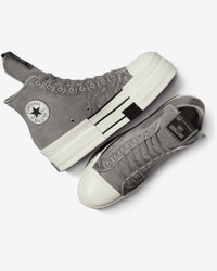 Fashion designer Rick Owens ups the ante on his transformative DRKSTR Chuck 70 with a double-stacked outsole and striking overdyed canvas—available in “concrete” and “blonde.” The subversive design both celebrates and distorts the lines of our most iconic silhouette—literally stretching the possibilities with an elongated tongue and raised platform while adding a distinctive speckled aesthetic to the signature cap, heel, and foxing tape. Benefits - Limited-edition high-top sneaker designed by Rick Owens with a canvas upper with overdyed color treatment, elongated tongue, and molded rubber double stacked platform - Signature toe cap, heel and foxing tape feature a distinctive speckled aesthetic - Molded rubber DRKSHDW toecap, rubber heel, and toe components - Custom molded DRKSHDW license plate on left heel, Converse branded license plate on right heel - Spare lace and custom branded wrap around woven label Product Details - Shown: Concrete - Style: A06755C-020