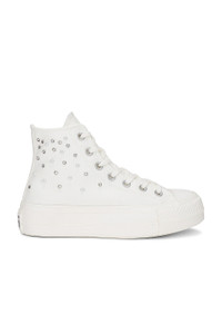 - Faux pearl and clear crystal embellished canvas upper with rubber sole - Made in Vietnam - Lace-up front - Converse All Star logo patch at inner side panels - Converse All Star license plate - Rubber toe cap - Approx 40mm/ 1.5 inch platform - Revolve Style No. CNVR-WZ352 - Manufacturer Style No. A10288C