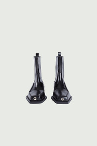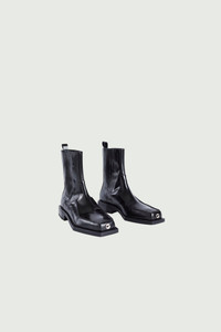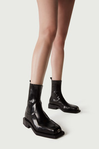Glossy black leather ankle boots with an angular silhouette. Details Black COPSH28479 Made in Italy Size and Fit Fits true to size