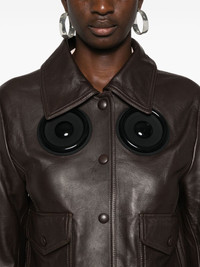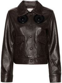 applique-detail leather jacket Highlights - Cedar brown - Leather - Pebbled texture - Tonal stitching - Spread collar - Long sleeves with press-stud fastening cuffs - Front applique detail - Two front flap pockets - Full lining - Straight hem - Front press-stud fastening Made in Italy Composition Lining: Viscose 100% Outer: Leather 100% SIZE & FIT Model measurements Height 5 ft 10 in(1.77 m) Bust/Chest 32.28 in(82 cm) Hips 35.03 in(89 cm) Waist 25.19 in(64 cm) FittingInformation Designed for a slim fit that sits just away from the body offering a close yet comfortable fit Firm leather offering little flexibility to maintain its durability and sturdiness This piece fits true to size – take your usual size