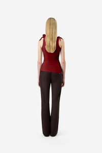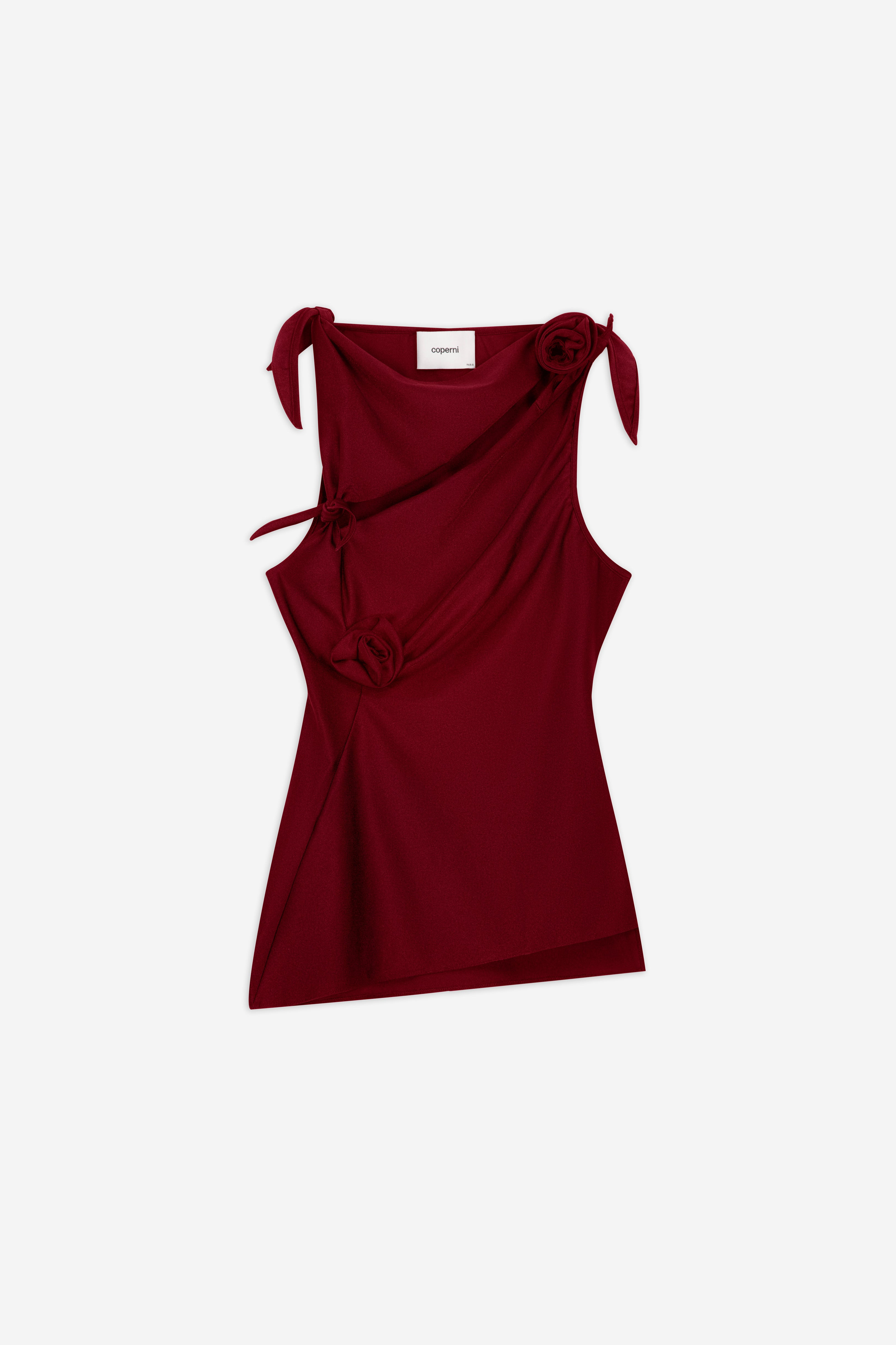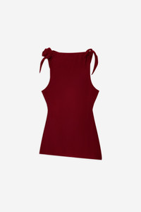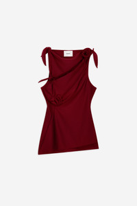 Crafted from technical stretch fabric in rich rhubarb red, this top plays with tension and release. Fabric is knotted and tied in asymmetrical gestures, revealing the skin across the shoulder and chest. Like a petal caught mid-twist, it combines structure and spontaneity in a single silhouette. Details Red Rhubarb COPT76545 Polyamide Made in France