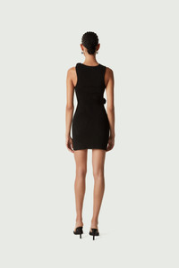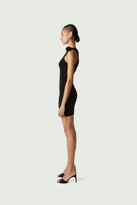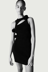 Black minidress with cut-out detail and flower embellishments. Cut with a subtle asymmetrical twist, this figure-sculpting minidress is gently ruched and embellished with a deep front slit. Cut from a finely ribbed, soft black jersey material, it has a dynamic cut-out neckline punctuated by three swirling fabric roses for a knotted effect. Details Black COPML58603 Size and Fit Model is 177 cm / 5.8 ft and wears size S