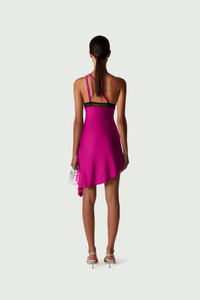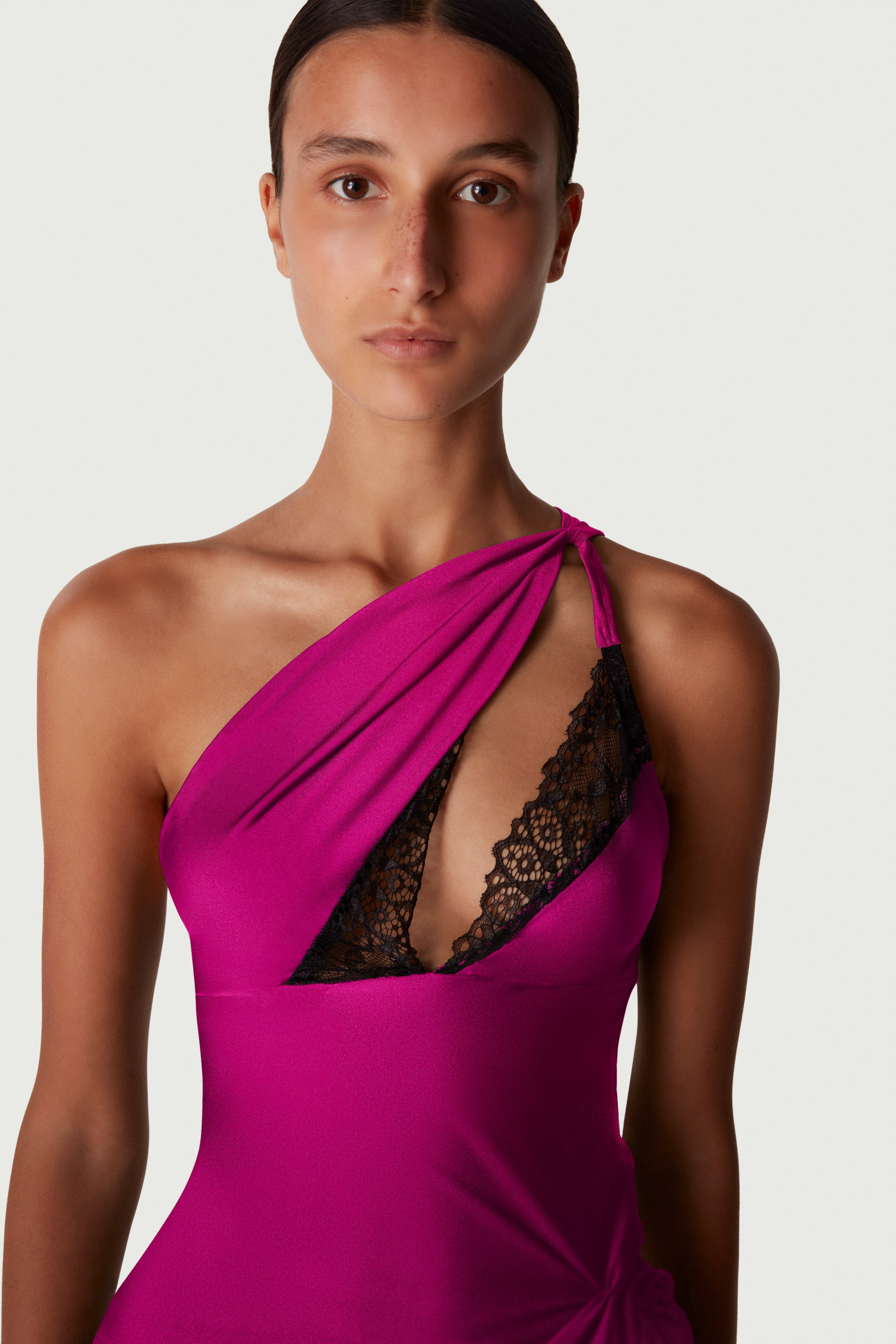 Stretch jersey minidress with statement neckline. Ruched at the waist for a tumbling effect, Coperni's asymmetric fuchsia minidress exudes energy and movement. It has a dramatic neckline that sweeps over one shoulder and plunges into a deep cut-out embellished with delicate black lace. Details Fuchsia 80% Polyamide, 20% Elastane Made in Italy COPR64545 Size and Fit Model is 174 cm / 5.7 ft and wears size S