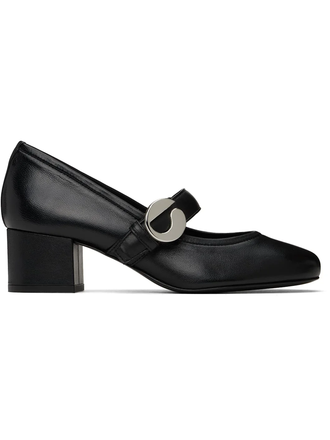 Buffed leather Mary Jane-style heels in black. · Logo hardware at post-stud strap · Buffed leather lining · Covered block heel with rubber injection · Leather sole · Heel: H2" Supplier color: Black Leather. Made in Spain 251325F122000