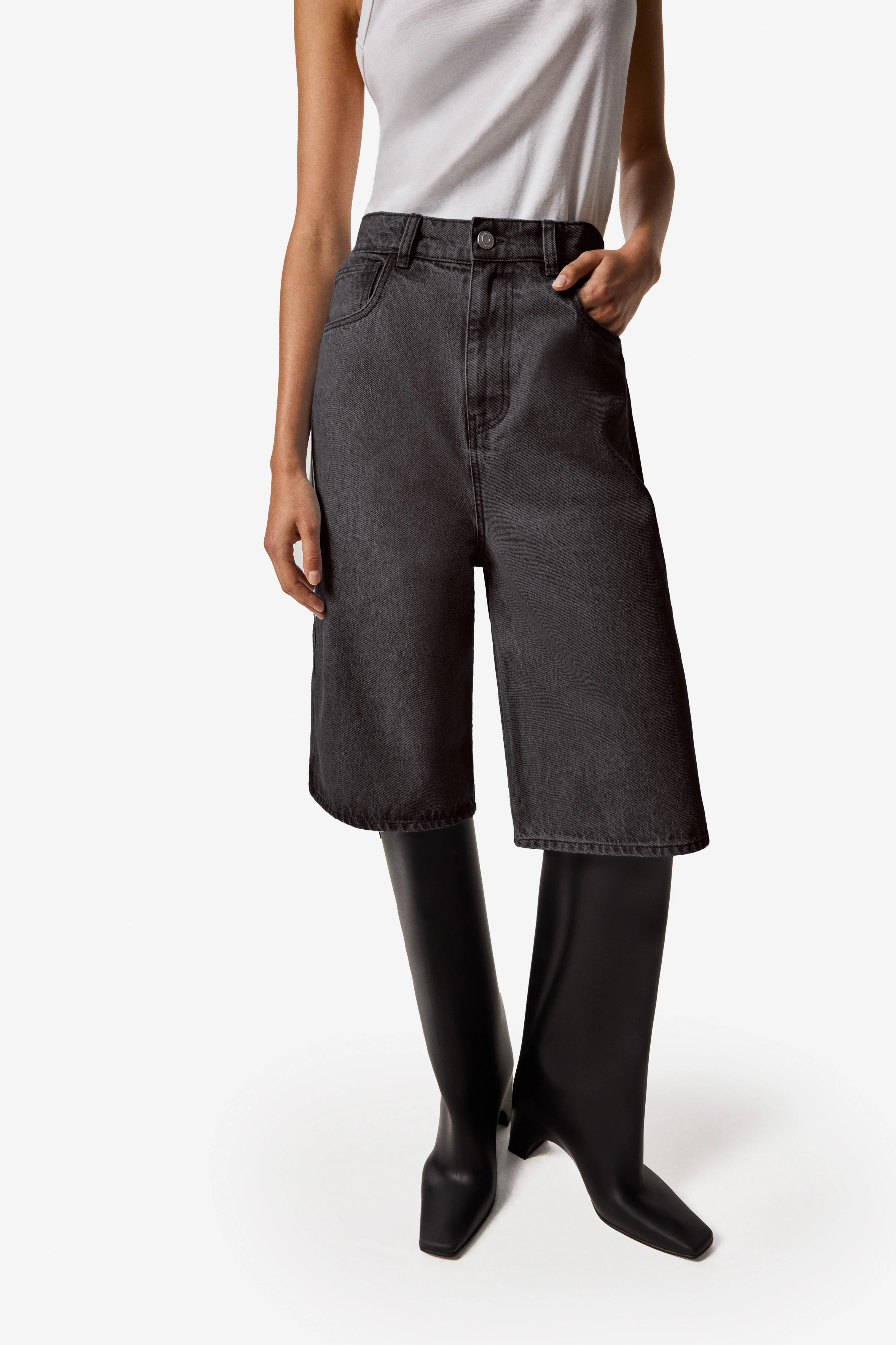 A relaxed pair of premium grey denim bermudas with a longline silhouette. They are tailored for a minimalist look that hangs straight and falls just below the knees with a classic button and concealed zip fastening at front. Details Grey 100% Cotton Made In Italy COPP86F2004 Size and Fit Model is 174 cm / 5.7 ft and wears size S