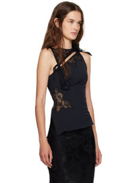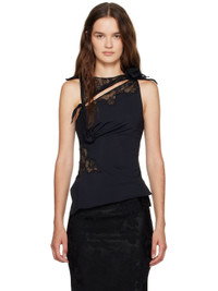 Stretch nylon satin top. · Draping and lace trim throughout · Knots and floral accents throughout · Asymmetric neck and hem · Cutout at chest · Vent at side seams Supplier color: Black 80% polyamide, 20% elastane. Made in France 252325F111006