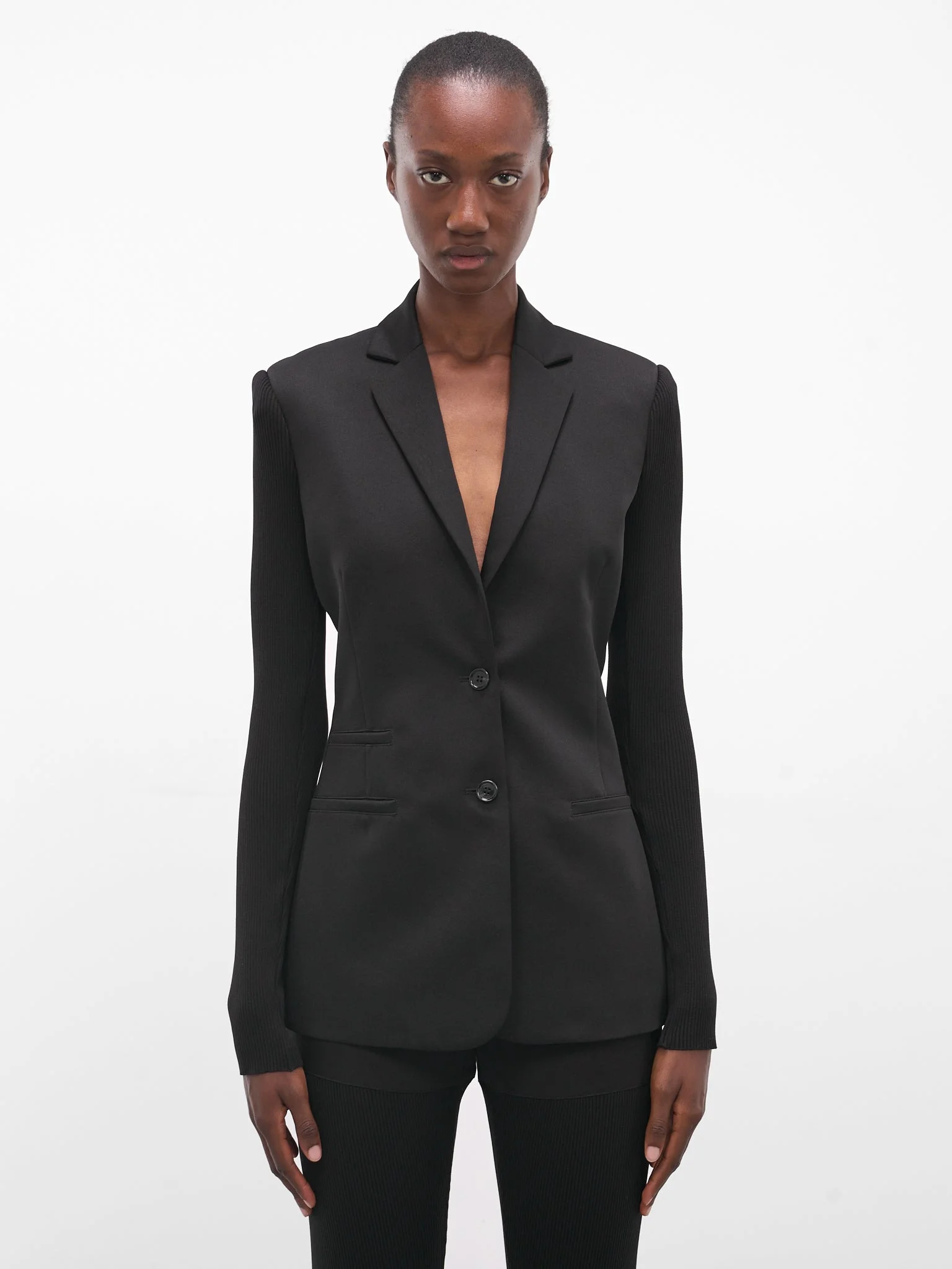 A black nylon blazer with a tailored slim silhouette. Designed with rib-knit sleeves, notched lapel, and logo hardware at the cuffs. Featuring: • Slim fit • Nylon construction • Notched lapel • Structured shoulders • Rib-knit long sleeves • Front button closure • Front welt pockets • Back vent • Logo hardware at cuffs • Made in Italy • 100% Polyamide • French sizing Model is 5'11" wearing size 36. Bust: 31.4" Waist: 24.8" Hips: 35"