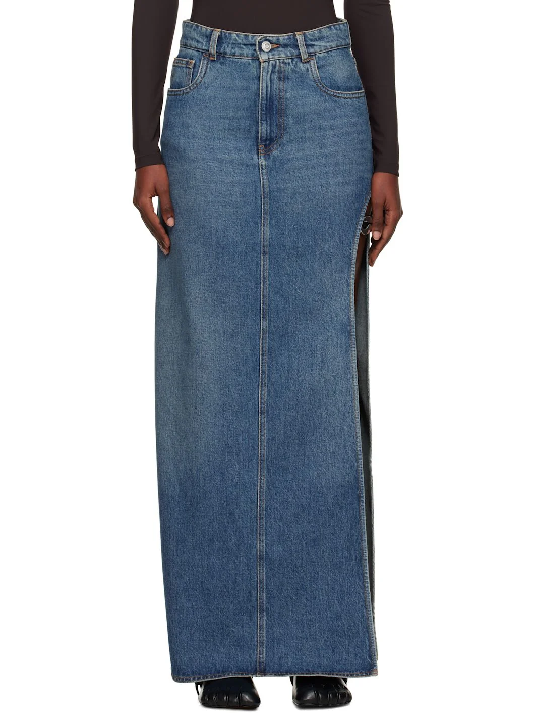 Non-stretch denim maxi skirt. · Fading and whiskering throughout · Belt loops · Five-pocket styling · Zip fly · Slit and elasticized post-stud strap at side seam Supplier color: Blue vintage Body: 100% cotton. Trim: 65% polyester, 35% cotton. Made in Italy 252325F093000