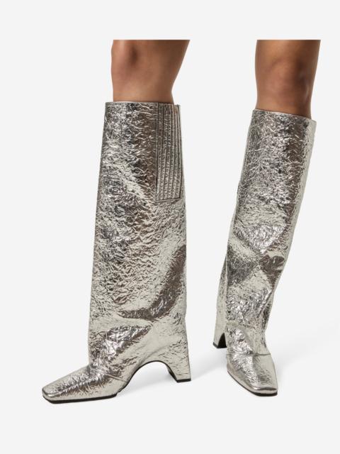 The Bridge Boot features a subtle triangular line that elongates the leg. Named for its arched sole, the style is completed with a solid block heel and a minimal, square-shaped toe. The design showcases a light texture, adding depth and richness while maintaining its architectural precision. Details - Composition: Calf Leather - Made in: Spain - Sku: COPSH03F6076