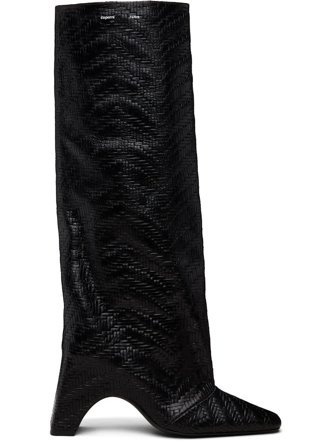 Knee-high woven leather slip-on boots. · Square toe · Logo printed at outer collar · Concealed elasticized gusset at inner side · Buffed leather lining · Block heel with rubber injection · Leather sole · Heel: H4" Supplier color: Brown Leather. Made in Spain 261325F114003