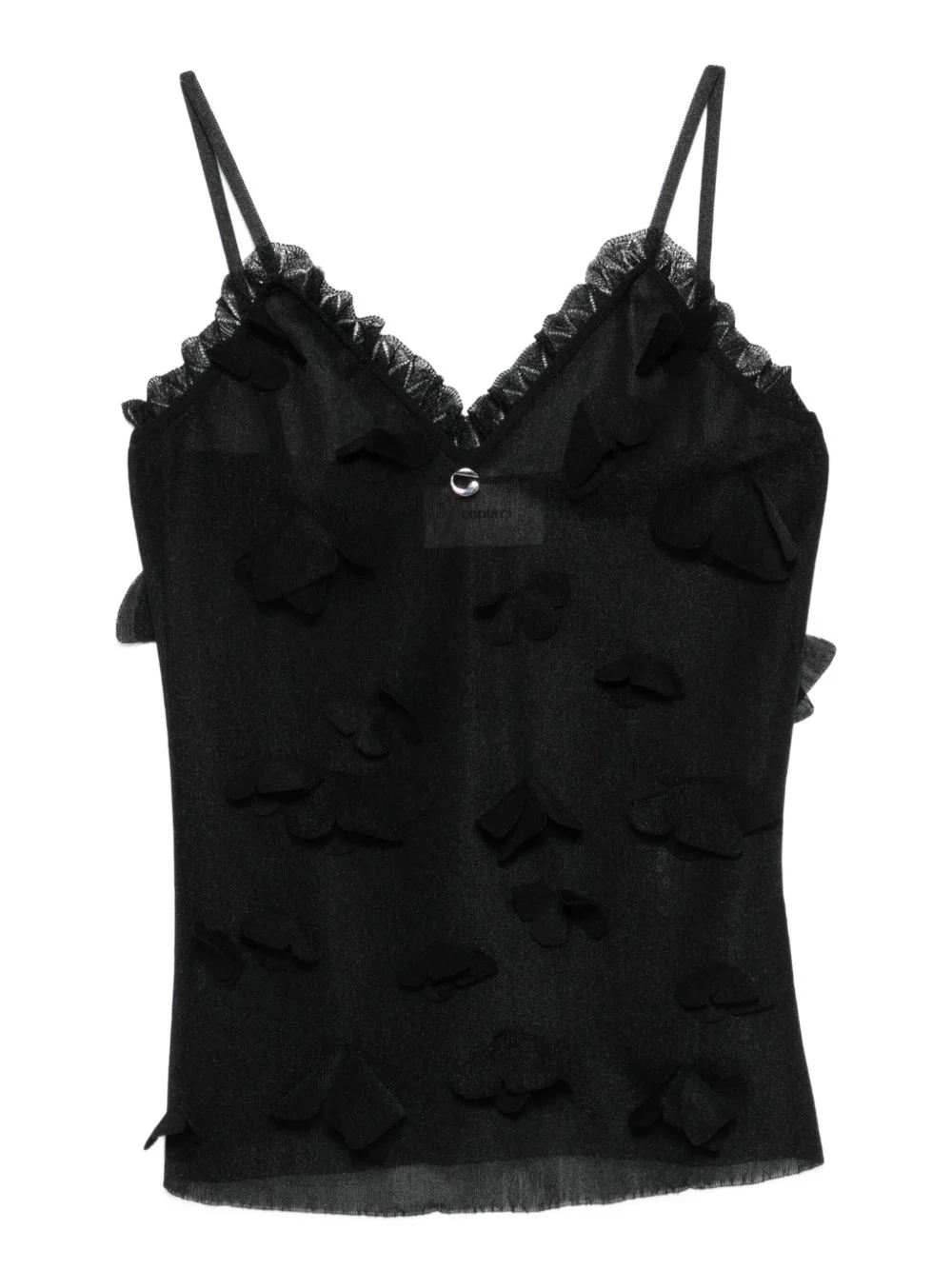 butterflies-applique top Highlights - Black - Butterfly embellishment - Ruffled trim - Spaghetti straps - V-neck Made in Italy Composition Polyester 100% Washing instructions Read Manufacturer Guidelines