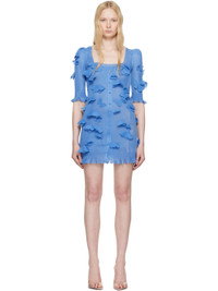 Semi-sheer knit polyester minidress. Metallic thread detailing and hand-sewn graphic appliques throughout. · Rib-knit square neck, hem, and cuffs · Button closure · Ruffled pointelle-knit trim at hem and cuffs Supplier color: Blue 100% polyester. Made in Italy 251325F052016
