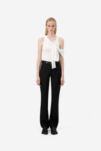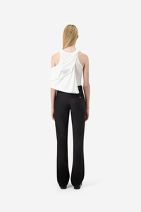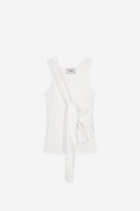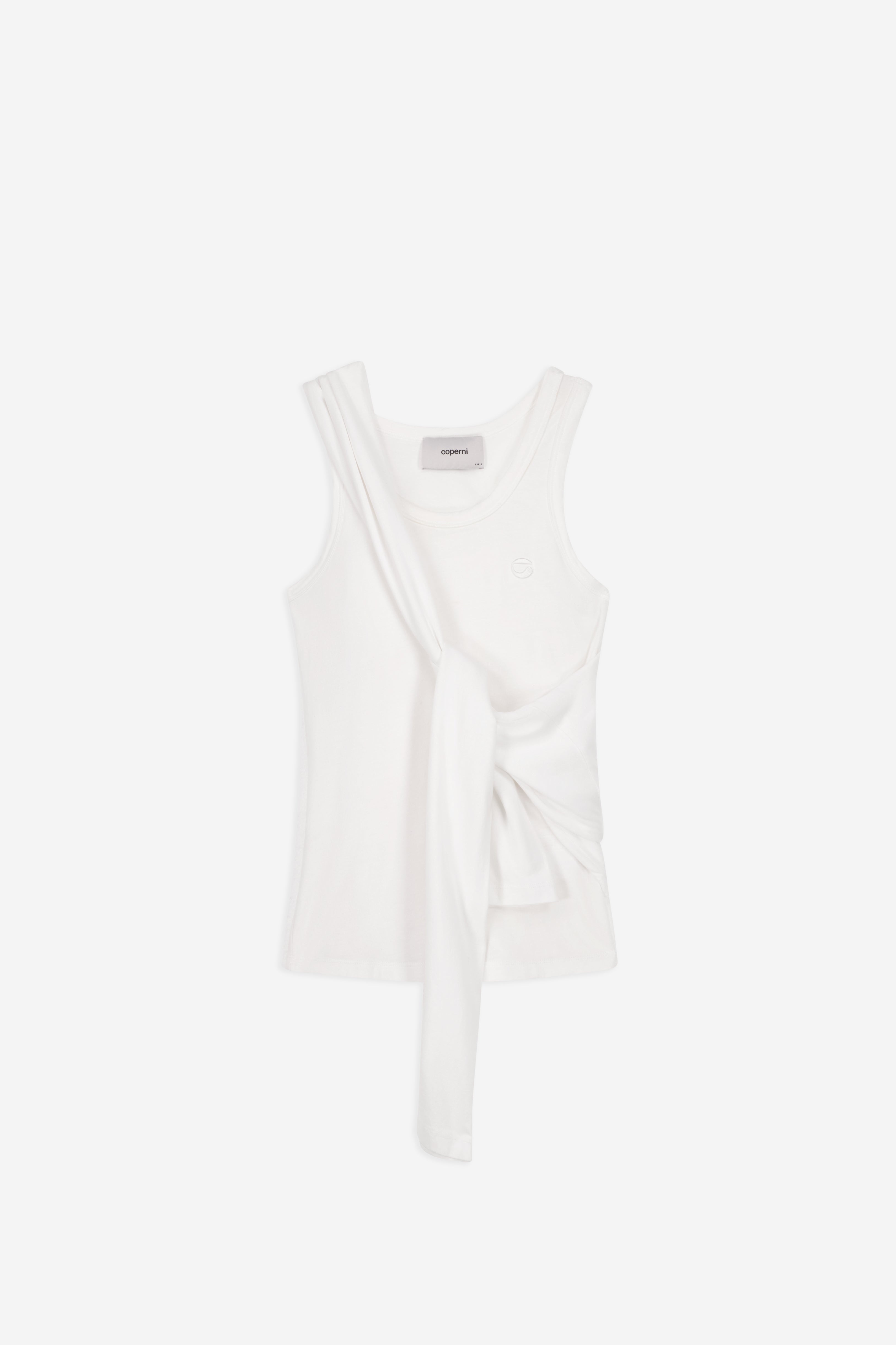 This sculptural tank top is cut from a soft cotton-modal blend with a second-skin feel. A knotted jersey panel is seamlessly integrated across the front, mimicking the casual gesture of a sweatshirt tied around the shoulders. The back features a folded construction detail - a subtle nod to Coperni's architectural codes. Clean, subversive and playfully practical. Details White COPJS161F5009 Cotton-Modal Made in Portugal