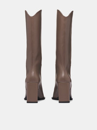 Brown leather cowboy boots reinterpreted with a sculptural twist. Defined by a slanted arched block heel that creates a sweeping bridge effect along the sole. Featuring: • Cowboy boot design • Calf-high length • Curved opening • Pointed toe • Sculptural block heel • Made in Spain • 100% Cow Leather • Italian sizing