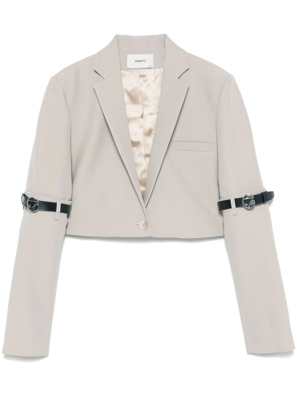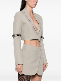 cropped blazer Highlights - Almond beige - Front button fastening - Shoulder pads - Logo-buckle detail Made in France Composition Outer: Recycled Polyester 100% Lining: Acetate 52%, Viscose 48% SIZE & FIT Model measurements Height 5 ft 10 in(1.78 m) Bust/Chest 33.46 in(85 cm) Hips 36.22 in(92 cm) Waist 23.22 in(59 cm) FittingInformation Designed for a relaxed fit, this piece allows for comfort and movement when worn The internal shoulder pads offer a structured shape Made from a midweight non-stretch fabric