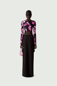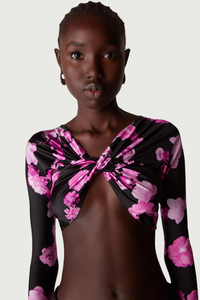 Cropped stretch top with a criss-cross front. Less if more when it comes to Coperni's knotted cropped top crafted from soft stretch fabric and embellished with pink and black blooms. The print is inspired by our special SS23 holographic print applied to exclusive bags this season. Designed like a bow, the criss-cross design is gentle against the skin, body-hugging and supportive. Details Pink / Black 100% Polymide COPJS38544 Made in Portugal Size and Fit Model is 180 cm / 5.9 ft and wears size S