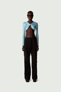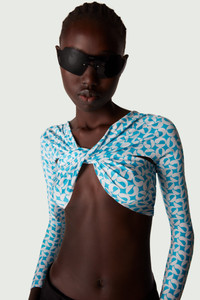 Cropped stretch top with a criss-cross front. Knotted cropped top crafted from soft stretch fabric and embellished with a blue monogram print. Designed like a bow, the criss-cross effect is gentle against the skin, body-hugging and supportive. Details Azur / White COPJS38546 Made in Portugal Size and Fit Model is 180 cm / 5.9 ft and wears size S
