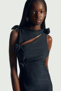 Cut with a subtle asymmetrical twist, this figure-sculpting gown is crafted from shimmering crystal-encrusted stretch fabric and is gently ruched for an hour-glass silhouette. Embellished with a deep front slit at the front. Its dynamic cut-out neckline is punctuated by three swirling fabric roses. Details Black COPR44855 80% Polyamide 20% Elastane Made in France Size and Fit True to size. Model is 180 cm / 5'11 ft and is wearing size S