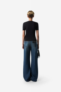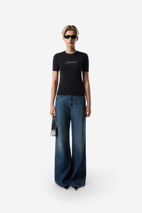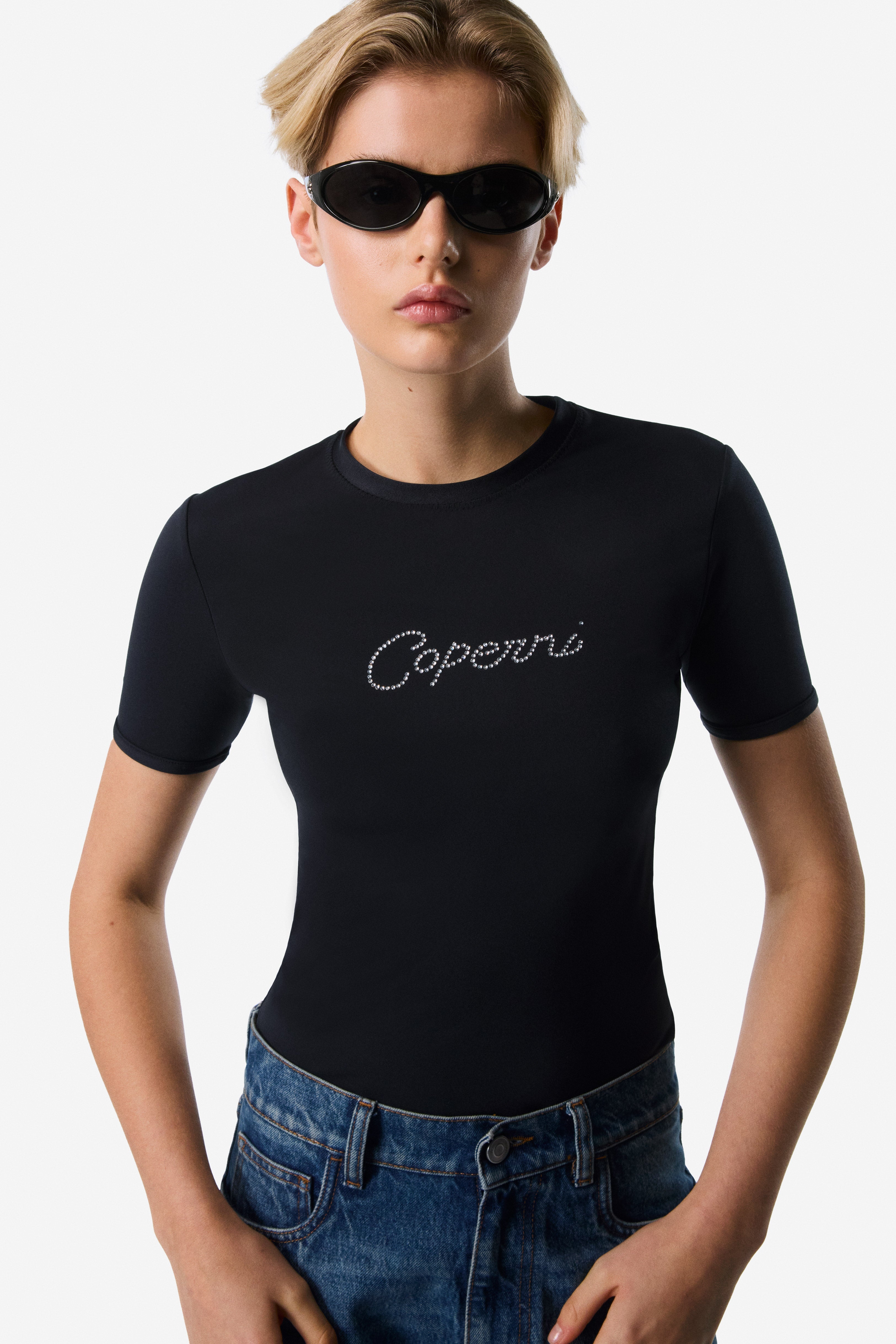 The soft jersey fabric of this lightweight T-shirt ensures a close fit that adapts to the shape of your body. Expertly designed to fit snuggly around the arms with imperceptible stitching throughout, the top can be comfortably layered. It is embellished with crystals which spell out the Coperni logo in cursive type. Details Black COPJS07CRF3023 80% Polyamide 20% Elastane Made in Portugal Size and Fit Model is 175 cm / 5.9 ft and wears size S
