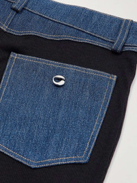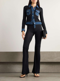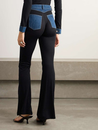 EDITORS'NOTES Coperni's pants unexpectedly combine elements of athletic styles and jeans. Made from a ribbed Lyocell-blend with touches of cotton, they have a denim waistband and pockets and fit slim before flaring out at the cuffs. SIZE & FIT Model measurements: - Fits true to size, however those who are between sizes should take the larger size - High-rise, designed for a skinny fit with a flared hem - Lightweight, stretchy fabric - Model is 175cm/ 5'9" and is wearing a size Small - Bust: 78cm/ 31" - Waist: 62cm/ 24.5" - Hip: 92cm/ 36" DETAILS & CARE - Black Lyocell-blend, blue denim - Button and concealed zip fastening at front - 64% Lyocell, 31% cotton, 5% elastane - Dry clean