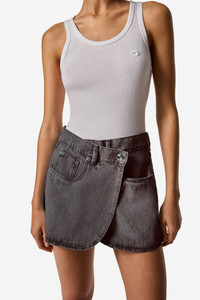 Dark grey pure cotton denim miniskirt with a cross-over style. It has a rounded hemline that softens the silhouette for an elegant take on a signature everyday staple. Details Grey 100% Cotton Made In Italy COPJ24F2004 Size and Fit Model is 174 cm / 5.7 in and wears size FR36