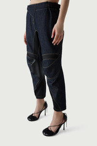Mid-rise biker style pure cotton denim trousers. These jeans have been crafted using a technical patchwork assembly with motor racing in mind. Cropped with a shapely silhouette that's supportive at the waist and slightly looser around the legs, the trousers have been engineered so that seams and inserts work together to create a sculptural effect that really flatters the form. They feature a side buckle on the right hip and a silver C logo at the back. Details Dark Navy 100% Cotton COPP45249 Made in Italy Size and Fit True to size. Model is 175 cm / 5'7" ft and is wearing size S.
