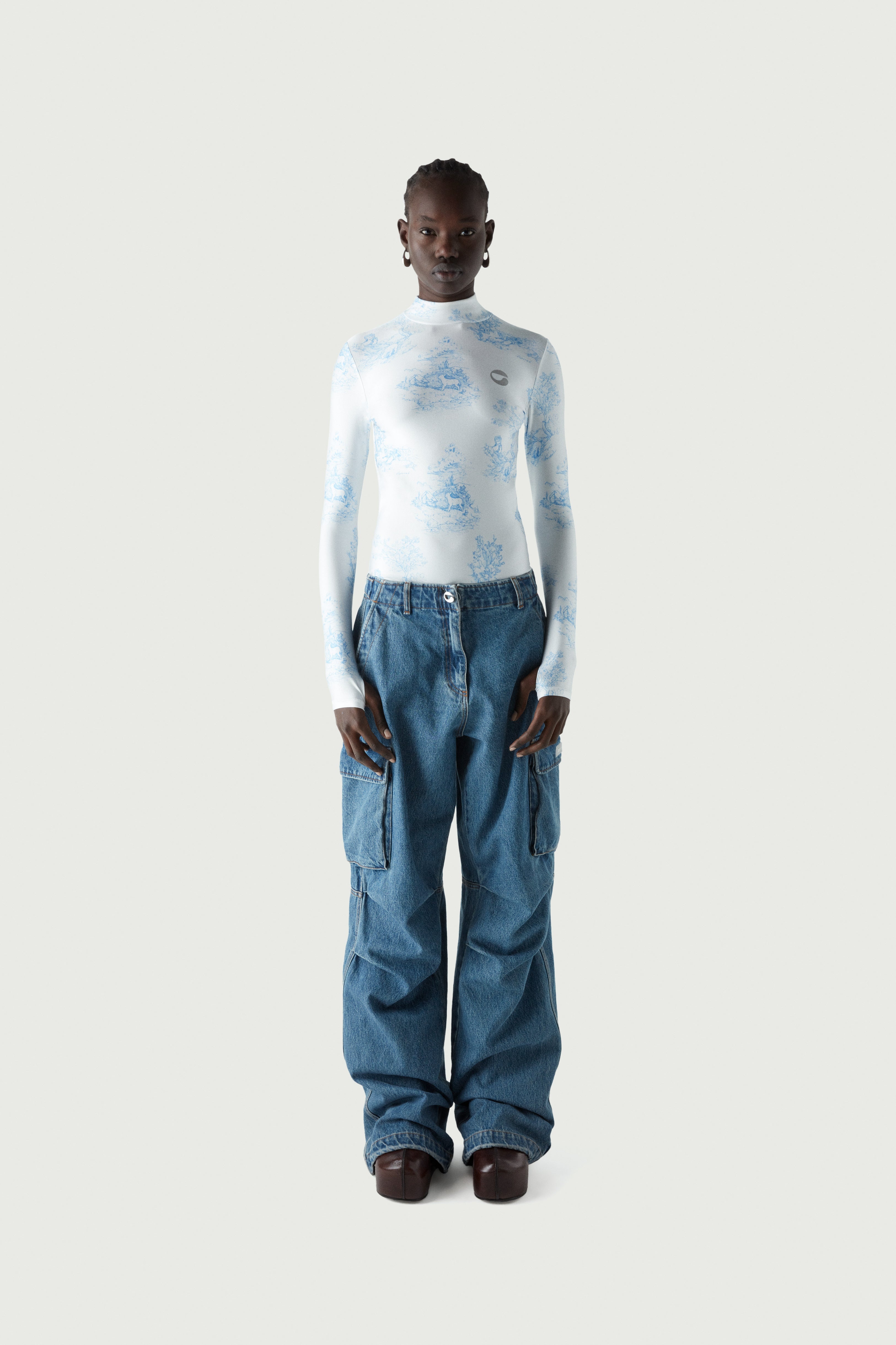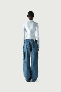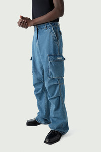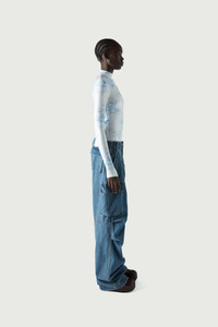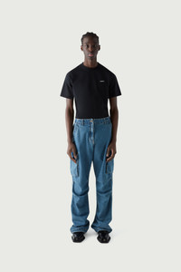 Loose fitting pure cotton denim cargo pants. Although loosely cut, you can refine the relaxed shape of Coperni's oversized cargo pants thanks to an adjustable waist band, which allows you to style them high above the navel, low slung on the hips, or somewhere in between. Ruffled knees, large patch pockets and extra long legs combine to strike the perfect balance between polished tailoring and easy utilitarian comfort. A back pocket is embellished with a white embossed C logo and there is a Coperni silicone patch appliqué at the front of the left side pocket. Details Washed Blue 100% Cotton COPP40202 Made in Italy Size and Fit Female model is 175 cm / 5'7" ft and is wearing size FR36. Male model is 185 cm / 6" ft and is wearing size FR36.