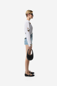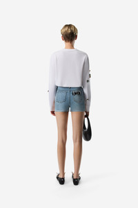 Collaborative shorts cut from pure cotton denim in a pale faded blue tone. The waistband is inspired by the princess tiara and features a central 'gemstone' point and dipped edges which curve around the hips. The piece pays tribute the most enchanting Disney characters who thrive, flourish and forever delight in stories that continue to capture the imagination. Details Blue Bleached 100% Cotton Made in Portugal