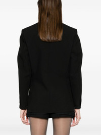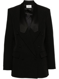 black recycled polyester satin trim peak lapels shoulder pads long sleeves buttoned cuffs two side flap pockets full lining double-breasted button fastening This item is made from at least 50% recycled or upcycled materials. For recycled synthetic clothing products, we highly recommend using a microfibre-catching washing bag to ensure that no microplastics that can pollute water are released in the process. Learn more about what makes a product Conscious on our Conscious Criteria page Size & Fit Model Measurements: Height: 1.8 m Bust/Chest: 80.0 cm Hips: 89.0 cm Waist: 62.0 cm Model wears size XS Fabric and Care Designer Style ID: COPV58138 Designer Colour: BLACK Composition: Outer: Recycled polyester 100%; Lining: Viscose 100% Washing instructions: Hand Wash Made in France