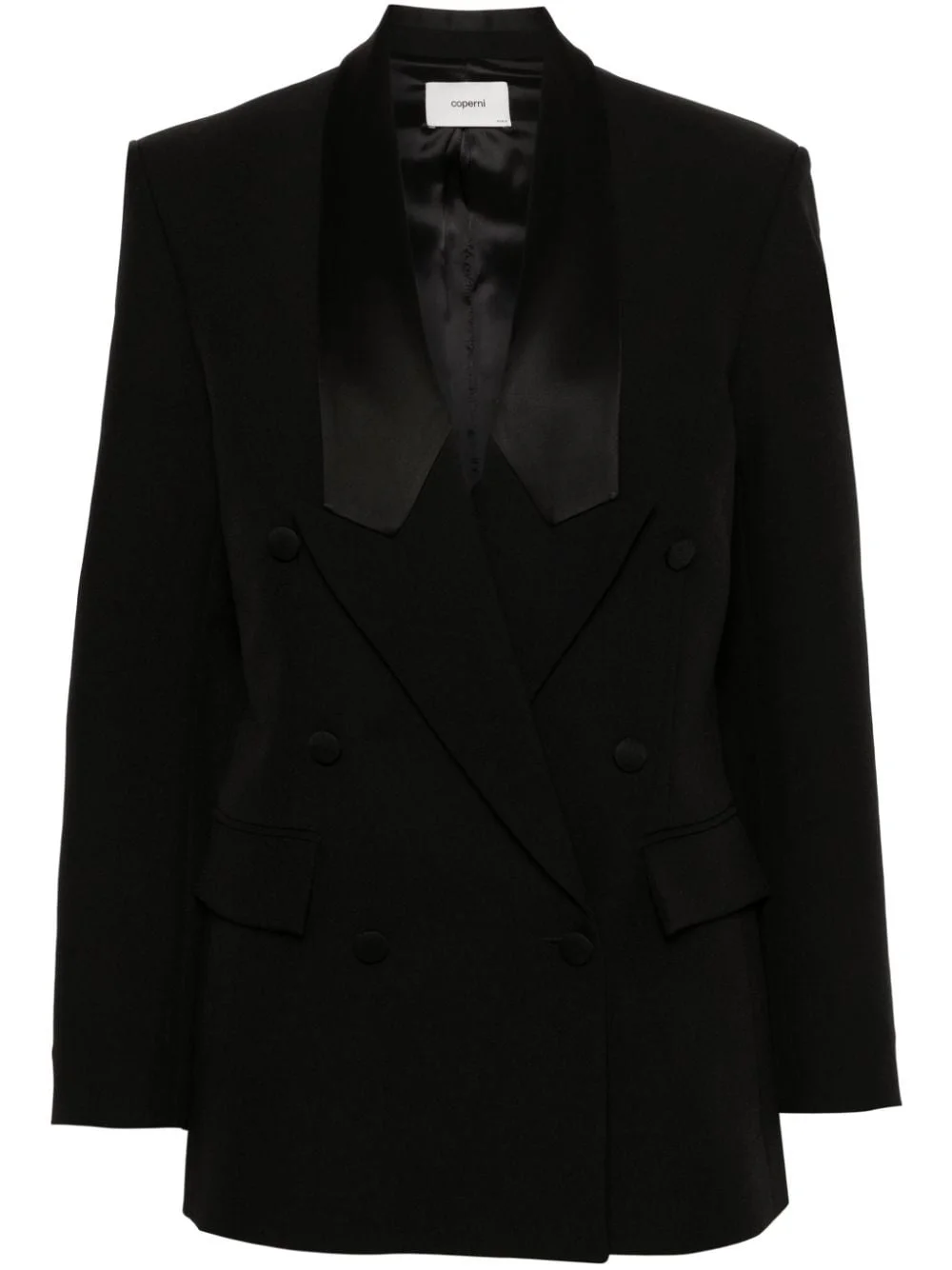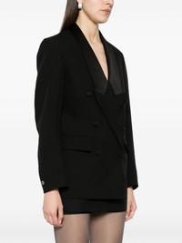 double-breasted blazer Highlights - Black - Recycled polyester - Satin trim - Peak lapels - Shoulder pads - Long sleeves - Buttoned cuffs - Two side flap pockets - Full lining - Double-breasted button fastening Made in France Composition Outer: Recycled Polyester 100% Lining: Viscose 100% SIZE & FIT Model measurements Height 5 ft 11 in(1.8 m) Bust/Chest 31.49 in(80 cm) Hips 36.22 in(92 cm) Waist 25.59 in(65 cm) FittingInformation Designed to be unstructured, offering a loose fit throughout The internal shoulder pads offer a structured shape Made from a midweight non-stretch fabric This piece fits true to size – take your usual size