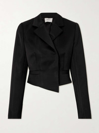 EDITORS'NOTES Coperni loves to challenge expectation, playfully re-imagining wardrobe classics. This double-breasted blazer is cut from satin-crepe in a cropped, asymmetric profile. It has darted seams, notched lapels, and lightly padded shoulders. SIZE & FIT Model measurements: - Fits true to size, take your normal size - Designed for a slim fit - Cropped length - Mid-weight, non-stretchy fabric - Model is 177cm/ 5'10" and is wearing a FR 36 - Bust: 79cm/ 31" - Waist: 61cm/ 24" - Hip: 89cm/ 35" DETAILS & CARE - Black satin-crepe - Concealed snap fastenings through double-breasted front - 100% polyester; lining: 100% viscose - Dry clean